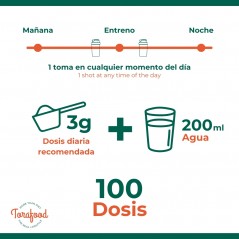 Mezclar una cucharada (aproximadamente 5g) con 250ml de agua o tu bebida preferida. Consumir antes o después del entrenamiento para obtener mejores resultados.