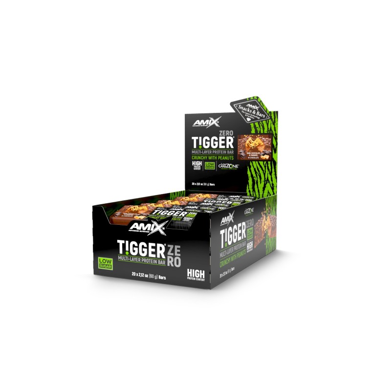Barritas Tigger Zero Protein 20x60g AMIX son snack proteicos deliciosos y nutritivos, formulados para aportar 20 g de proteína por barrita. Ideales para satisfacer el hambre, apoyar la recuperación muscular y mantener los niveles de energía durante el día.